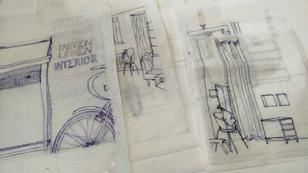 Die auf Transparenpapier durchgepausten Vorzeichnungen zu „Interior“